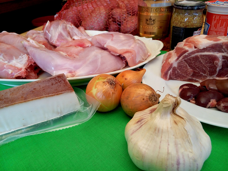 Králík (stehna, přední běhy, masitý hřbet) – vepřová krkovička 500 g – špek 100 g – vepřové sádlo 2 lžíce – 1 palička česneku – 2 cibule – hladká mouka – drůbeží nebo králičí vývar 1 l – máslo 80 g – smetana na šlehání 100 ml – francouzská hrubozrnná hořčice 4 lžíce – brambory 1,5 kg – pepř, sůl