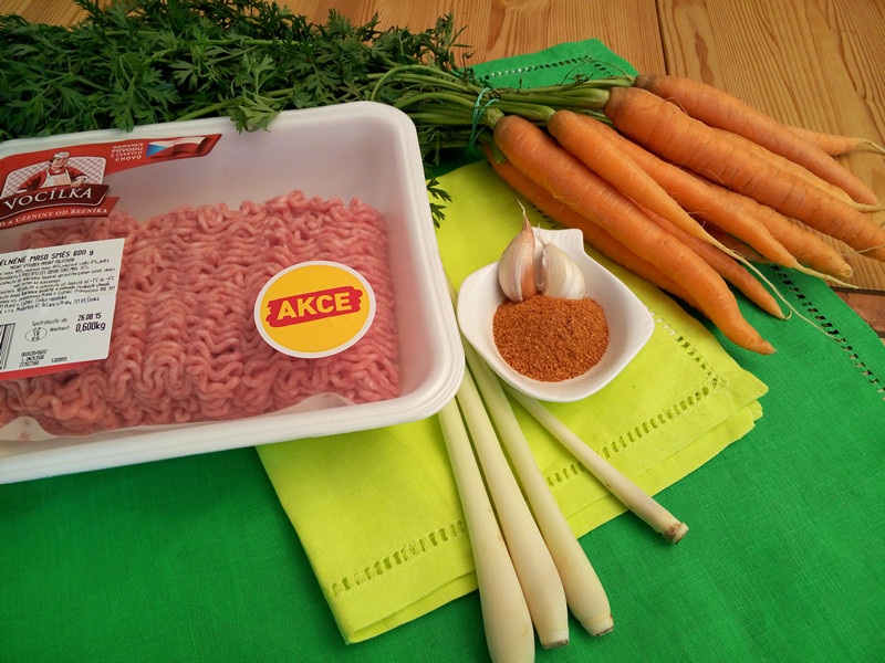 Mleté maso vepřové nebo míchané 600 g – římský salát – ½ svazku čerstvé karotky – ½ salátové okurky – jarní cibulka – česnek 4 stroužky – koření tandoori 2 lžíce – citronela (citronová tráva) 1-2 kusy – šťáva z ½ citronu nebo limety – olivový olej – pepř, sůl