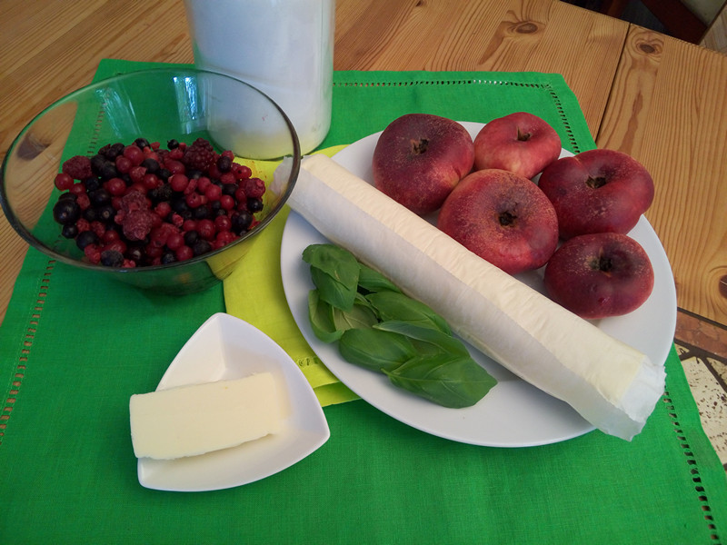 Ploché nektarinky nebo jiné broskve 0,5 kg – listové těsto – letní bobule (např. borůvky) – 30 g másla – 10 lístků bazalky – moučkový cukr na posypání