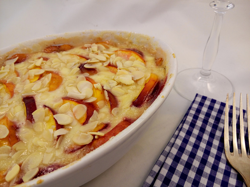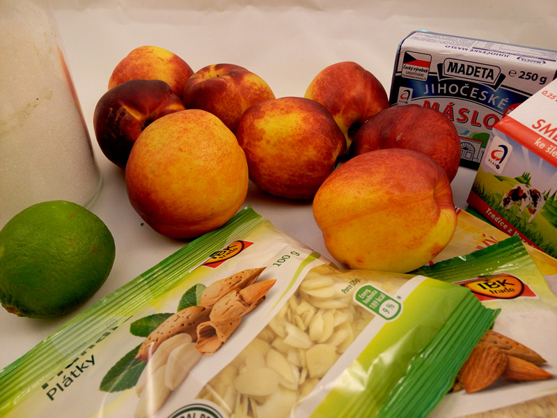 4 broskve nebo nektarinky – 40 g mandlových plátků – 40 g mandlového prášku – 200 ml smetany na šlehání – 1 balení vanilkového cukru – 2 lžičky kukuřičného škrobu – 60 g cukru – 1 limeta – máslo na vymazání pečící formy