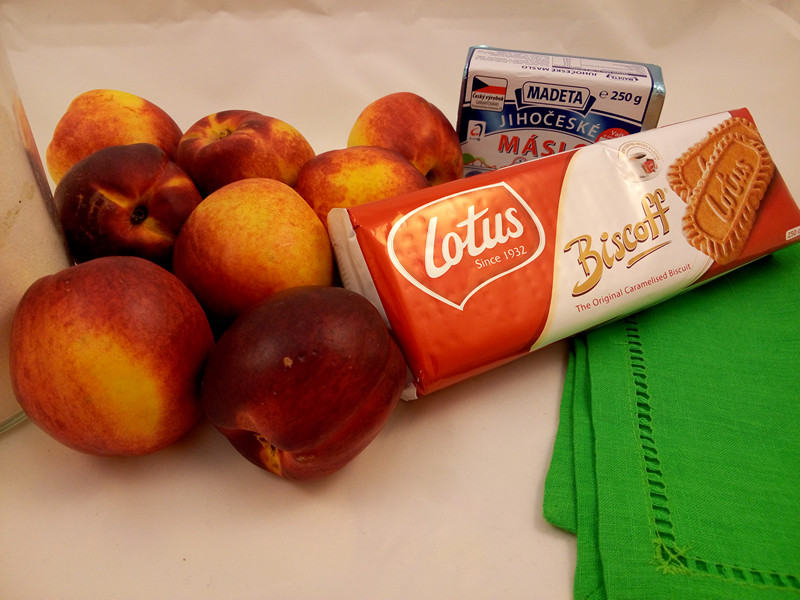 4 broskve nebo nektarinky – ½ balení (cca 125 g) karamelových sušenek Lotus – 100 g hladké mouky – 80 g másla – 30 g cukru krystal – máslo na vymazání pečící formy