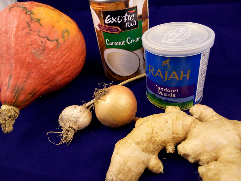 1 menší dýně Hokkaidó cca 1 kg – 1 lžíce indického koření Tandoori Masala – 100 ml smetany na šlehání nebo kokosového mléka – 1 střední cibule – kousek zázvoru (velikost palce) – 3 stroužky česneku – hrst šípků nebo ½ lžíce co nejmíň sladké šípkové zavařeniny – olej dýňový nebo olivový – pepř, sůl