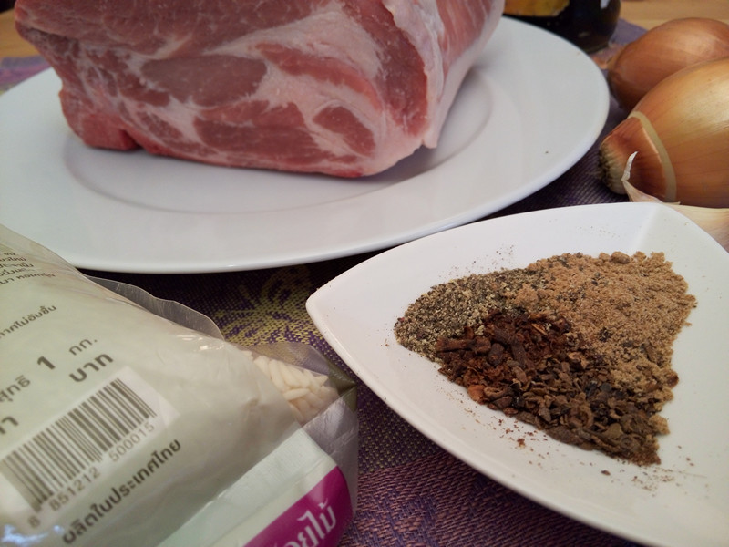 Vepřová krkovička cca 700 g bez kosti / 1 kg s kostí – sójová omáčka 150 ml – 2 cibule – 1 stroužek česneku – 100 g cukru – citron – muškátový oříšek – nové koření – mletý koriandr – hřebíček – pepř – olej