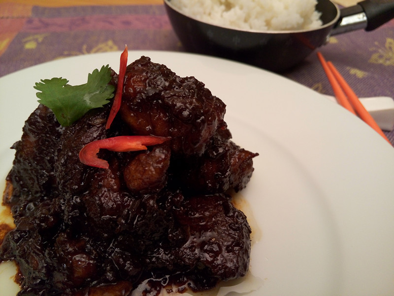 Maso podáváme s rýží nebo nudlemi, dozdobíme čerstvým koriandrem a červenou pálivou papričkou.