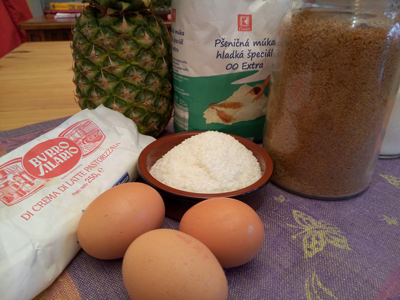 Hladká mouka 250 g – 3 vejce – 500 ml mléka – 35 g másla – 2 střední ananasy – 50 g strouhaného kokosu – 50 g třtinového cukru – cukr moučka na posypání – sůl, olej