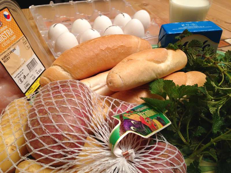 5 rohlíků – 5 vajec – 150 ml mléka – mladé kopřivy – máslo 20 g – pepř, sůl