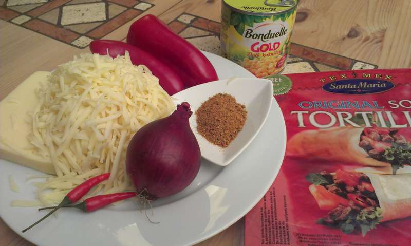Tortilly balení 8 ks – Eidam 0,38 kg – Kukuřice Bonduelle 1 ks – Rajčata cherry 250 g – Paprika kapie 2 ks – Koriandr čerstvý – 1 červená cibule – Směs mexického koření (fajitas, taco, …) – ¼ limety – Česnek 1 stroužek – Jarní cibulka 1/3 svazku – Pepř, sůl – Olivový olej