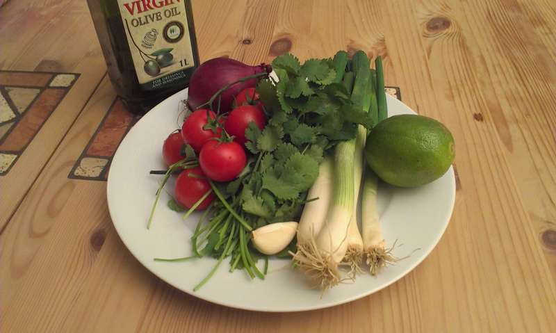 Mezitím posekáme najemno kapii, druhou polovinu červené cibule, koriandr, cherry rajčata, jarní cibulku, utřeme česnek. V misce vše promícháme, přidáme dvě lžíce olivového oleje, pepř a sůl, šťávu ze zhruba 1/3 limety podle chuti. Salsu promícháme a necháme odležet.