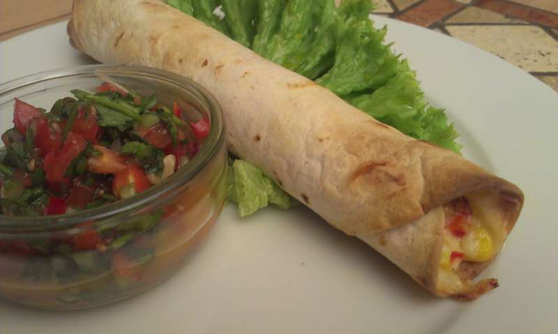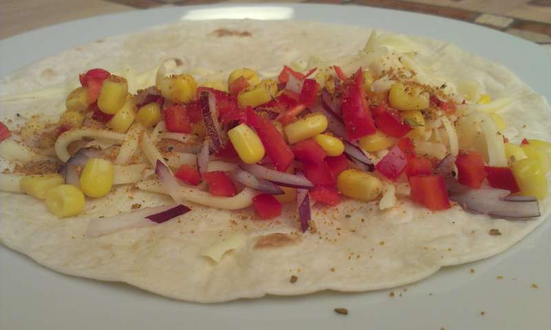 Na začátek tortilly dáme nastrouhaný sýr, posekanou zeleninu s kukuřicí, trochu mexického koření a opět sýr. Zarolujeme a dáme na plech koncem tortilly dolů, aby se nám neotevírala. Dáme do trouby péct na zhruba 10 minut, hlídáme.