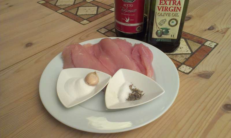 Očištěná kuřecí prsa rozřízneme na výšku podélně a v potravinové folii jemně rozklepneme na placku. Česnek utřeme nebo protlačíme a přidáme k balzamikovému octu, 2 lžícím olivového oleje a 2 lžícím cukru. Směs promícháme a dáme do ní marinovat kuřecí prsa, zhruba na půl hodiny.