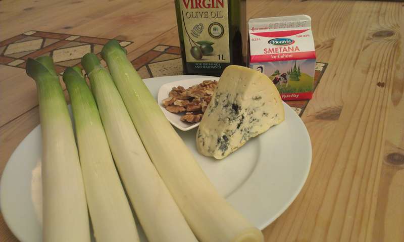4 střední pórky – Niva 120 g – 33% smetana 150 ml – 2 lžíce vlašských ořechů – Olivový olej 1 lžíce