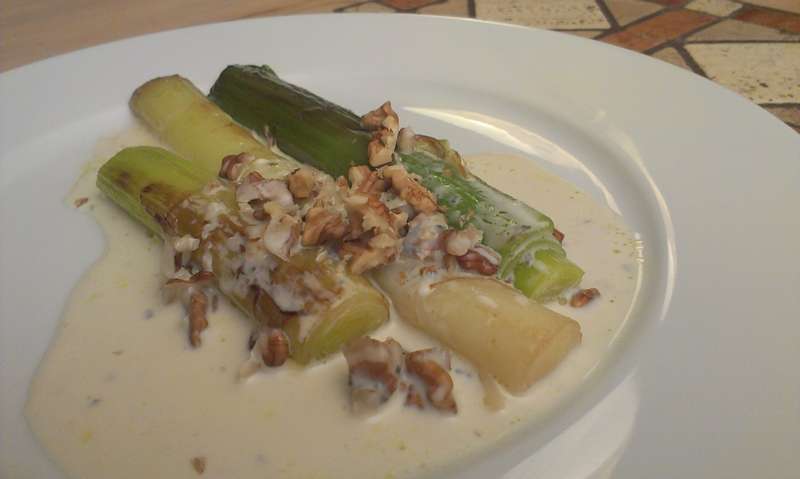 Orestované pórky podáváme přelité sýrovou omáčkou.