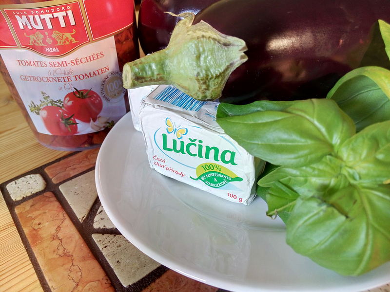 2 menší lilky – čerstvý sýr (Lučina) 200 g – sušená rajčata v oleji 100 g – bazalka – olivový olej – pepř, sůl