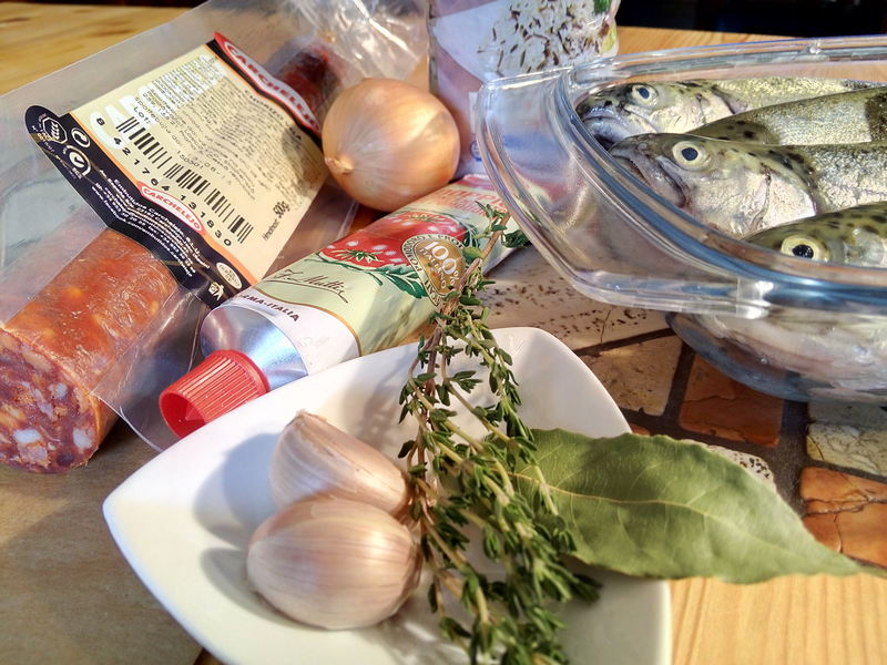 Pstruh duhový 4 ks – chorizo (španělský salám) cca 200 g – 1 cibule – 2 stroužky česneku – olivový olej – 2 rajčata nebo lžíce rajčatového protlaku – snítka rozmarýnu, tymiánu, 1 bobkový list – pepř, sůl – rýže