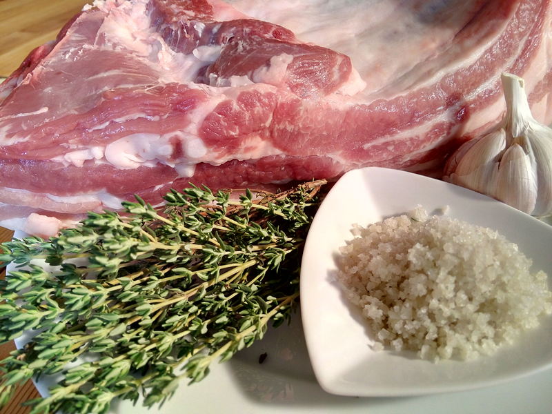 Vepřový bok 1,5-2 kg – 5 stroužků česneku – 4 snítky tymiánu – sůl