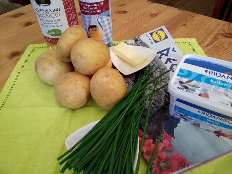 1 kg raných brambor – kozí sýr 400 g – pažitka nebo rukola, případně baby špenát – 30 g másla – 3 lžíce olivového oleje – 1 lžíce bílého vinného octa – pepř, sůl