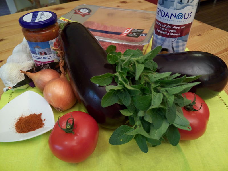 2 větší lilky – 500 g mletého masa – 1 velká cibule – 3 stroužky česneku – oregano (2 lžičky) – paprika sladká mletá (1 lžička) – 2 velká rajčata – rajčatová omáčka s lilkem – olivový olej – pepř, sůl