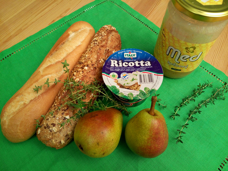 2 střední bagety – ricotta 200 g – 2 hrušky – 2 lžíce medu – čerstvý tymián – pepř, sůl