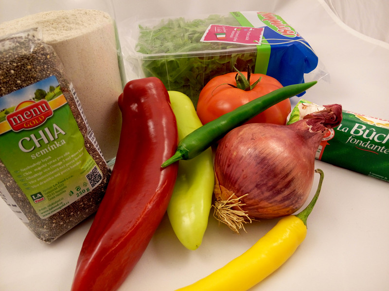 100 g semínek chia – 300 g pohankové mouky hladké – 1 lžíce cukru – 1 lžička droždí – ½ lžičky soli – sezónní zelenina (paprika, rajče, rukola, cibule) – sýr (např. balkánský, kozí rolka, nebo mozzarella) – olivový olej na pokapání – pepř, sůl