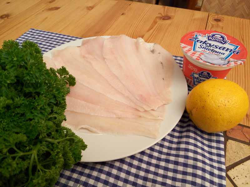 Filety z platýse cca 600 g – listová petržel 2 svazky – zakysaná smetana 3 lžíce – šťáva z 1/3 citronu – olej na smažení – sůl, pepř, hladká mouka na obalení