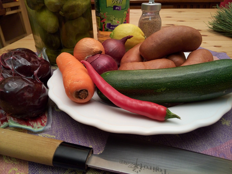 Špekáčky 6 ks – 1 menší cuketa (zelená nebo žlutá) – 1 červená cibule – 1 žlutá cibule – sterilované okurky – 1 bio citron – 1 velká mrkev – vařená červená řepa – chilli paprička – mletá červená paprika – čerstvě mletý černý pepř – hořčičné semínko – ocet – sůl