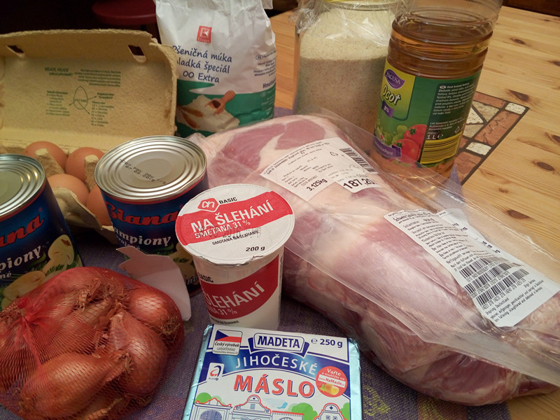 Vepřová plec cca 700 g – 60 g másla – 200 ml smetany ke šlehání – sterilované žampiony (1 konzerva) – 4 šalotky – hladká mouka – sůl, pepř