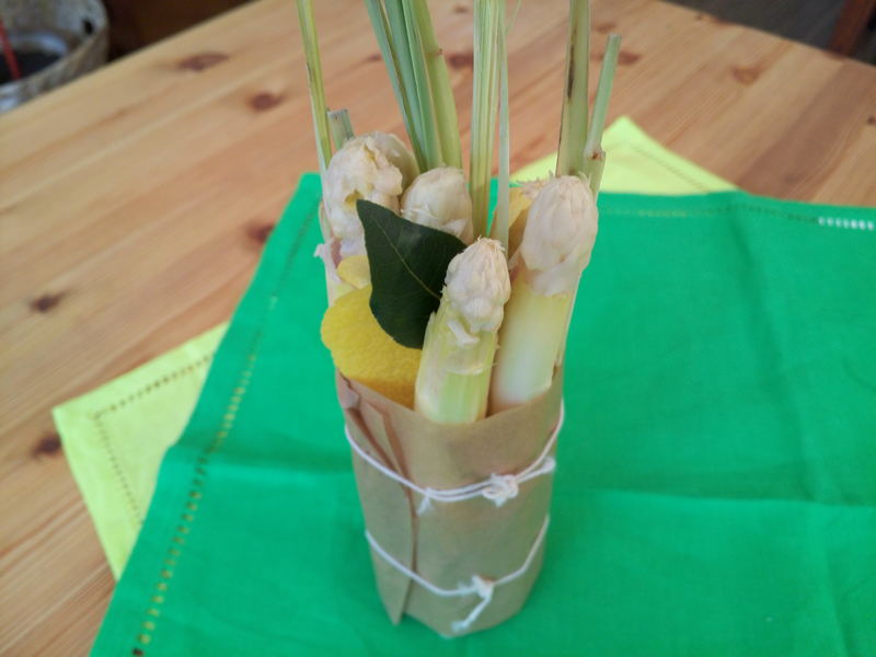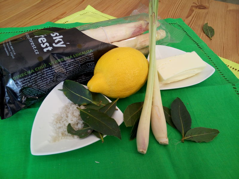 500 g bílého chřestu – máslo 60 g – citronela (citronová tráva) 2 stonky – 6 bobkových listů – limetová nebo citronová kůra – hrubozrnná sůl