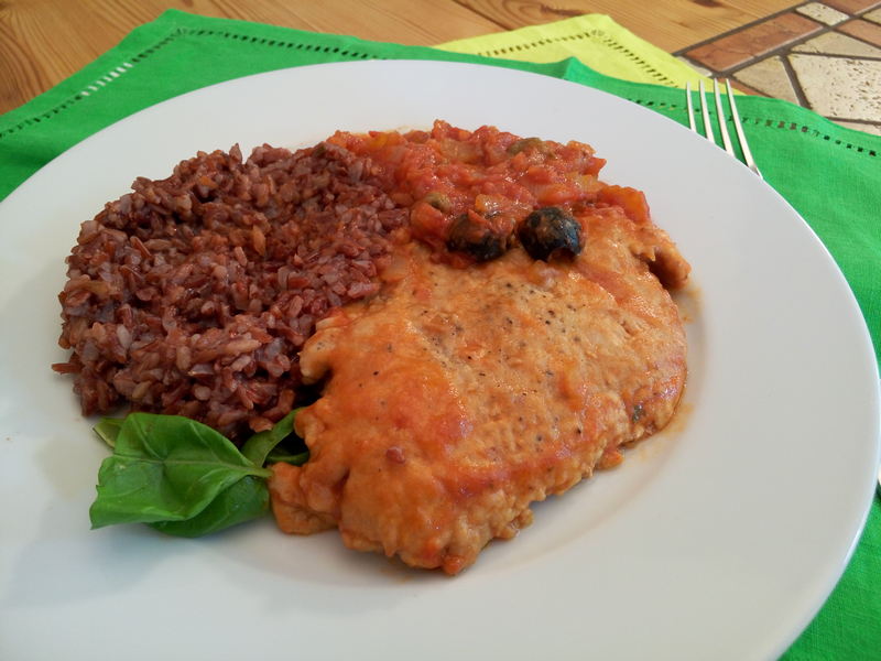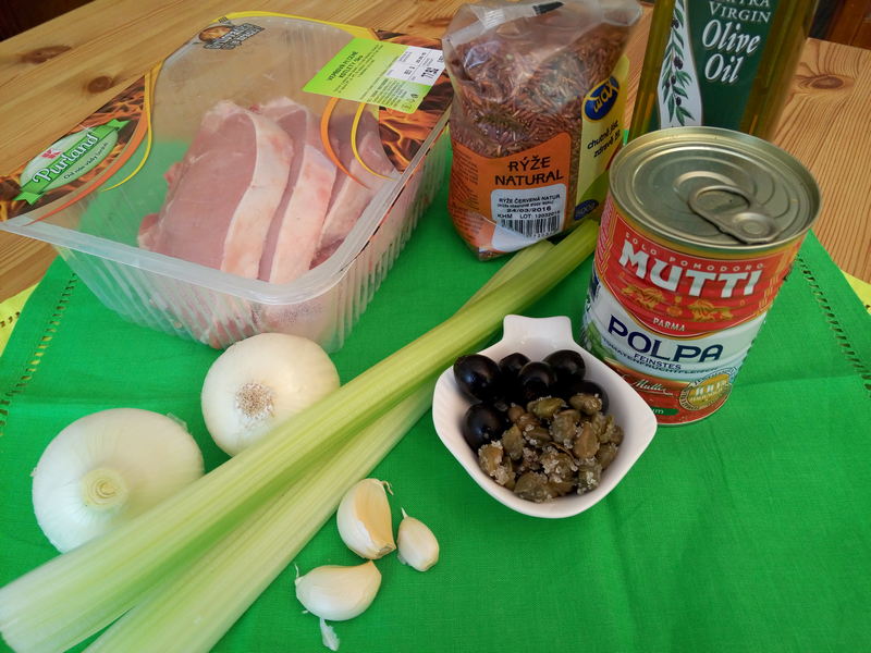 Vepřová kotleta s kostí (4 plátky – cca 650 g) – 1 konzerva rajčatové dužiny s bazalkou – 2 menší bílé cibule – 3 stroužky česneku – 2 řapíky celeru – pár oliv (zelených nebo černých), pár kapar (není nutné) – 4 lžíce hladké mouky – olivový olej – pepř, sůl
