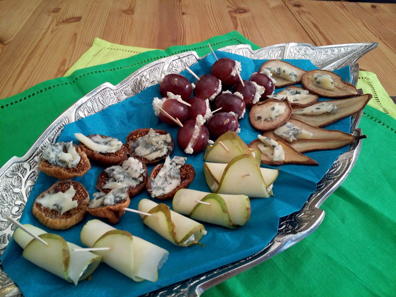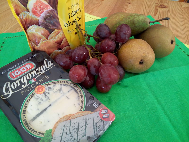 Gorgonzola picante nebo dolce 200 g – 2 hrušky – hroznové víno – sušené fíky – 1 lžíce tučného bílého jogurtu nebo zakysané smetany