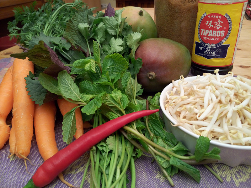 Vepřová panenka cca 500 g – zázvor cca 5 cm – 4 stroužky česneku – 2 lžíce sójové omáčky – 0,2 l ananasového džusu – 1 lžíce třtinového cukru – 1 zelené mango – karotka (zhruba stejné množství jako manga) – čerstvý koriandr – 2 snítky máty – divoká bazalka nebo jiné asijské bylinky, které máme k dispozici – klíčky mungo (velká hrst), nebo jiné klíčky – sůl, pepř, červený pepř, olej