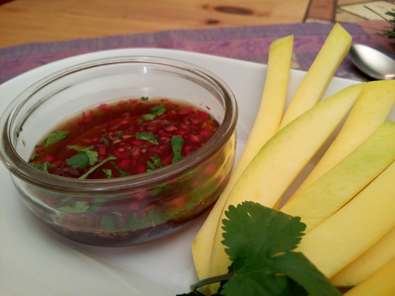V malé zavařovací sklenici nebo ve skleničce smícháme rybí omáčku s cukrem a posekanou chilli papričkou a důkladně promícháme, aby se cukr rozpustil. Pokud máme mango už přece jenom trochu zralé, přidáme do omáčky šťávu z půlky limety.