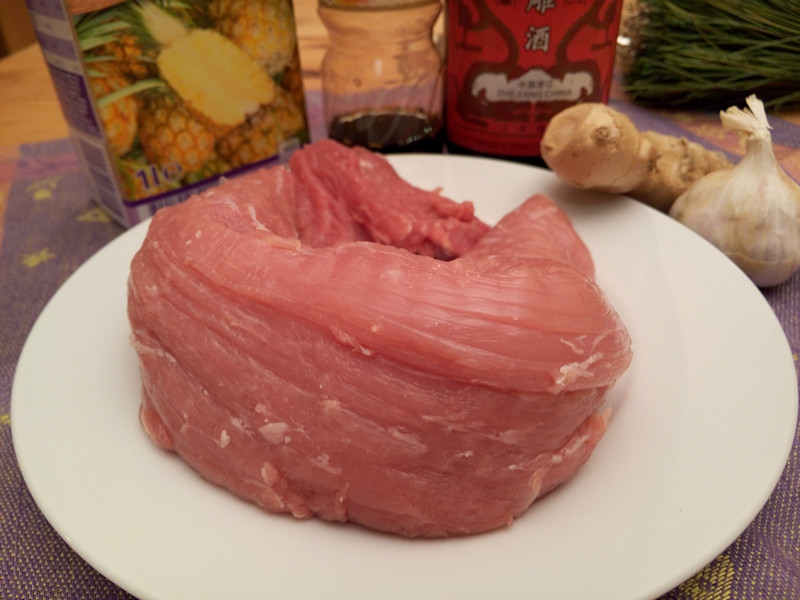 Zázvor a česnek ustrouháme najemno, smícháme se sójovou omáčkou a ananasovým džusem. Do takto připravené marinády dáme začištěnou vepřovou panenku v celku nebo na dva kusy a necháme zhruba 1 hodinu marinovat při pokojové teplotě.